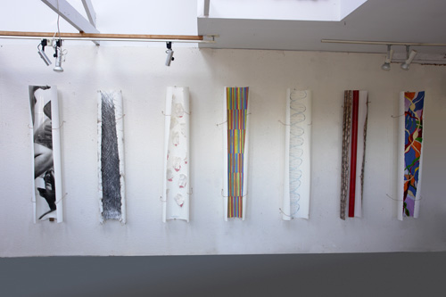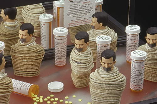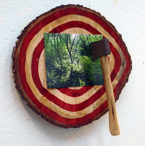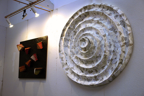 The mixed- media works employ everyday objects as the physical media, subject, and as metaphor, to explore both